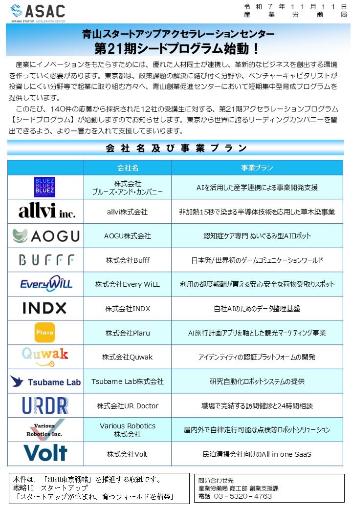 ASACスタートアップアクセラレーション シードプログラム第21期受講者12社が決定、11月11日(火)のキックオフイベントにて5か月のプログラムを開始いたします!