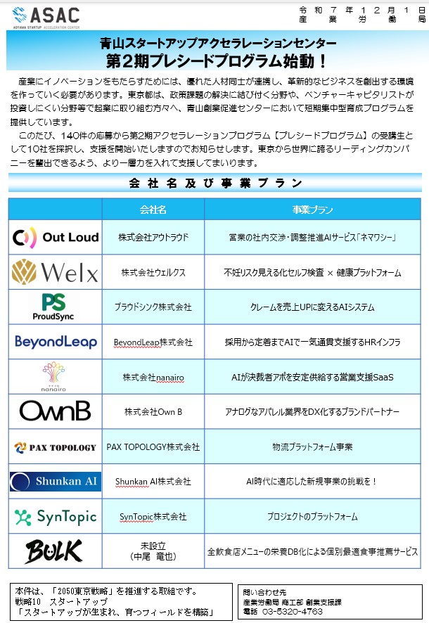 ASACスタートアップアクセラレーション シードプログラム第2期受講者10社が決定、12月3日(水)のキックオフイベントにて3か月のプログラムを開始いたします!